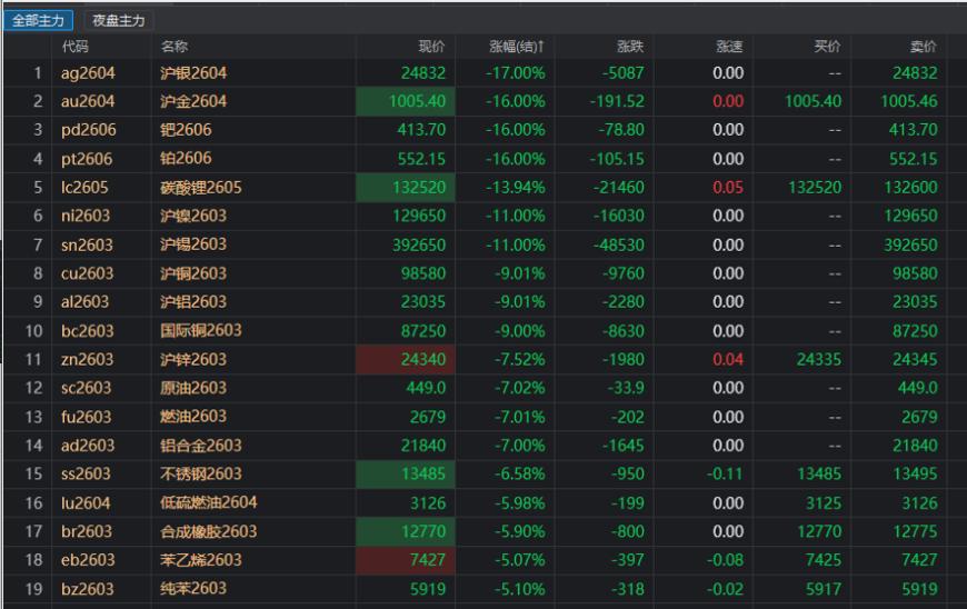 跌幅方面,沪银、钯、铂、沪锡跌停,沪金跌11.68%;基本金属全部下跌。此外,能源、黑色、化工、航运等板块也都出现不同程度的下跌。当日下午开盘后,原油、燃料油、铜、铝合金等多个品种纷纷跌停。