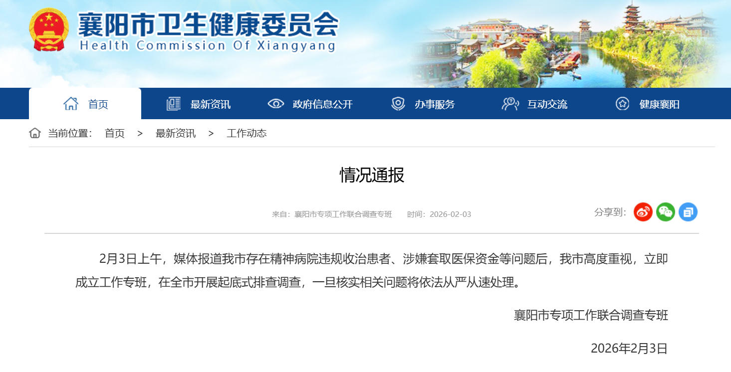 正文 精神病院违规收治患者涉嫌套取医保资金?湖北襄阳通报 三木 V管理员 /02-04 /0 评论 /10 阅读 0204 文章最后更新时间2026年02月04日,若文章内容或图片失效,请留言反馈! 中新网2月3日电 据襄阳市卫健委网站消息,襄阳市专项工作联合调查专班2月3日发布情况通报称,2月3日上午,媒体报道襄阳市存在精神病院违规收治患者、涉嫌套取医保资金等问题后,襄阳市高度重视,立即成立工作专班,在全市开展起底式排查调查,一旦核实相关问题将依法从严从速处理。