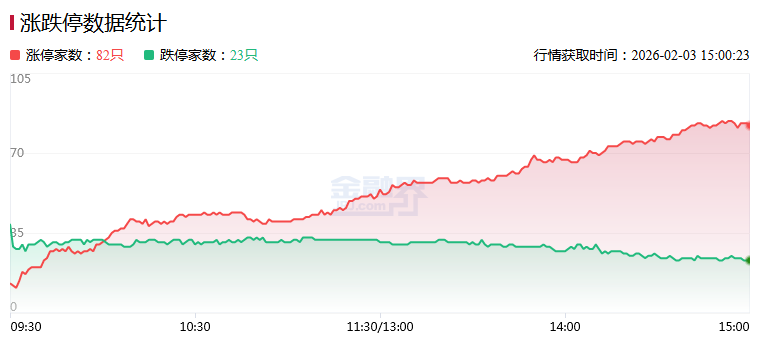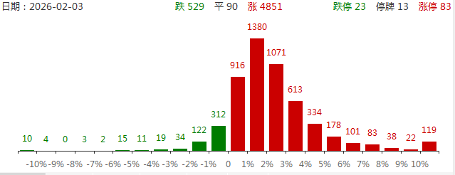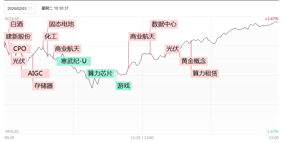 2月3日,市场探底回升,截至收盘,沪指涨1.29%,深成指涨2.19%,创业板指涨1.86%。沪深两市成交额2.54万亿,较上一个交易日缩量405亿。盘面上,市场热点快速轮动,全市场超4800只个股上涨,82只股票涨停。从板块来看,商业航天概念爆发,巨力索具、通宇通讯、神剑股份、中超控股等多股涨停。太空光伏概念持续走强,国晟科技、金晶科技、泽润新能、海优新材封涨停。化工板块表现活跃,红宝丽3天2板,万丰股份4连板。贵金属概念探底回升,湖南黄金7天6板。AI应用概念反复活跃,浙文互联11天5板。下跌方面,银行板块走势较弱,中国银行震荡下跌。