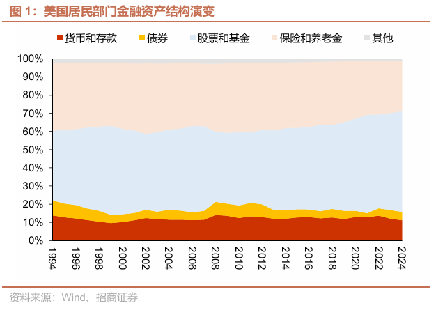1996-2024年间,美国居民部门持有的金融资产中保险和养老金明显上升,货币和存款、债券、股票和基金占比均下降。截至2024年,美国居民部门金融资产结构为:货币和存款占比11.2%,债券4.5%,股票和投资基金份额占比55.3%,保险和养老金占比27.8%,其他金融资产占比1.2%,较1995年分别变动-1.6个百分点、-3.1个百分点、+14.7个百分点、-8.6个百分点、-1.5个百分点。股票和基金占比大幅提升,现金和存款、债券、保险和养老金占比均下降。