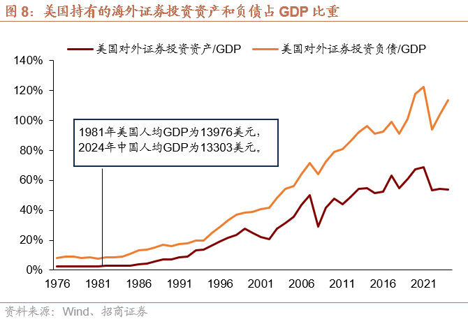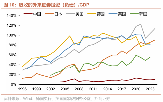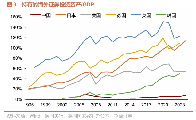人均GDP上升、收入增加加大居民持有海外金融资产意愿。随财富增加,居民在满足基本需求后,倾向于多元化配置资产,包括增加海外投资以分散风险并追求更高收益。因此,高收入人群也往往更早、更广泛配置海外资产。从国际经验看,发达国家持有的海外证券投资资产和外来的证券投资资金与GDP之比均远高于中国。2024年,中国对外证券投资资产/GDP和中国对外证券投资负债/GDP之比分别为7.6%、10.3%,而美日德英韩之中水平最低的韩国在上述两个指标上分别达到50.1%,55.7%,为中国的5倍以上,日本为114%和90%,为中国的10倍以上。