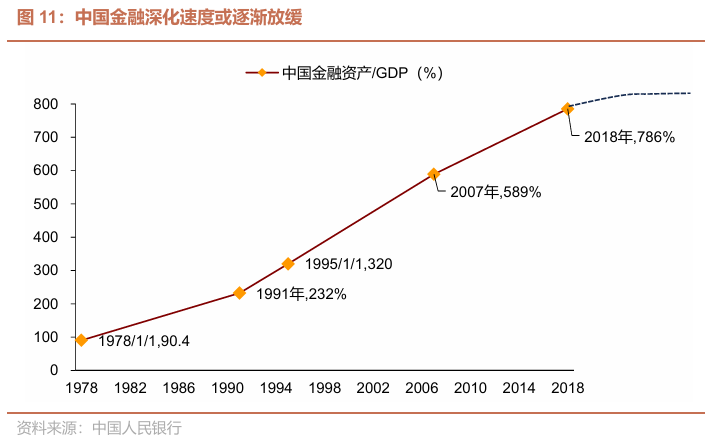 联系此前两个阶段,2007-2018年我国金融资产增速与GDP增速之差继续呈现下台阶的趋势。预计未来金融资产增速或进一步向GDP增速收敛,中国金融深化速度可能进一步放缓。主要原因有三:一是稳住宏观杠杆率和管控系统性金融风险的要求限制了未来各部门债务的增长速度;二是考虑到宏观经济环境和金融市场情况,特别是“新国九条”的政策措施,直接融资尤其是股票融资增长较慢的态势难以大幅扭转;三是房地产的影响:房地产与金融资产之间存在对偶关系:一是房地产是居民和企业的重要资产,居民和企业又通过房地产融资构成对银行的负债,银行的金融资产部分对应着居民和企业手中的房地产。二是大量贷款以房地产为抵押品投放,房地产价格上升会通过抵押品渠道撬动更多的贷款,两者之间会相互强化。近年来,房地产进入下行周期、建设和销售放缓,客观上也会拉低金融资产增速。