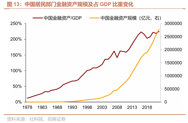 我国居民持有金融资产规模持续增长,占GDP比重2016年以来大体持平。中国社科院根据国际标准编制了1978—2022 年中国居民部门资产负债表,对中国居民持有的金融资产规模及通货、存款、 债券、 股票、股权、基金等各类金融资产规模作出了统计。截至2022年,中国居民持有的金融资产规模为277.4万亿元,1978年以来持续增长;金融资产与GDP之比为225%,2016年之前这一比重呈明显上升趋势,2016年以来比重趋于稳定。