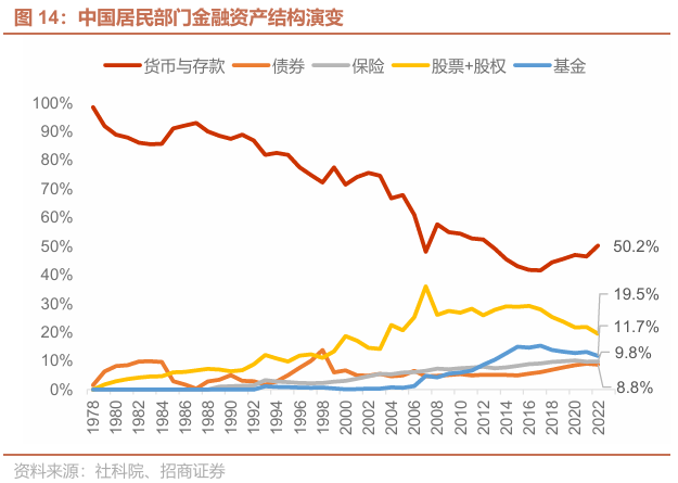 从发展趋势看,2017-2022年,中国居民金融资产结构进一步向货币存款、保险、债券倾斜,符合老龄化和低利率的影响,与日德情况相近。根据社科院国家资产负债表数据,2022年我国居民金融资产中货币与存款、股票和股权、基金、保险、债券50.2%、19.5%、11.7%、9.8%、8.8%,较2017年分别变动+8.6个百分点、-8.4个百分点、-3.6个百分点、+0.7个百分点、+2.7个百分点,货币与存款、债券、保险占比上升,股票和股权、基金占比下降。2017年以前货币与存款占比呈下降趋势,2017年以来货币与存款占比重新回升;2017年以前股票和股权、基金占比呈上升趋势,2017年之后下降;2011-2022年债券占比总体呈上升趋势;保险占比呈缓慢上升趋势。