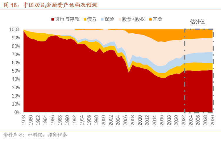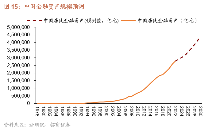 金融资产总量方面,根据社科院居民金融资产负债表中2022年中国居民金融资产规模为277.4万亿元。假定金融深化基本接近尾声,十五五期间中国居民金融资产的增速与名义GDP一致。2026-2030年中国名义GDP增速为6.83%,据此推测,2025年、2030年中国居民金融资产规模将分别为315万亿、439万亿,2030年的规模较2025年增长39%。