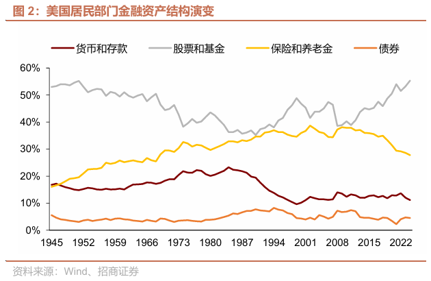 美国居民持有的保险和养老金占比较高,2012年以来股票和基金占比显著上升,占比超过50%。1945-2009年,美国居民部门持有的保险和养老金占比呈上升趋势,达到高点38.1%。分结构看,1980年代以来,伴随着美国401k计划和相关政策的完善,居民的养老金资产占比不断提升;2010年以来,保险资产的占比有所下降。2012年以来,美国居民持有的股票和基金部分占比持续上升,与美股长牛的表现一致,达到2024年的55.3%。2000年以来美国居民的货币与存款占比大体持平,债券占比下降。