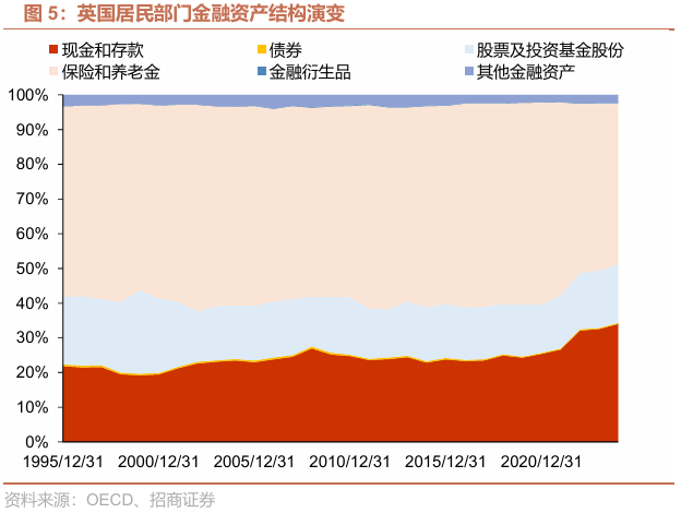 4、英国:保险和养老金占比近半,货币存款占比三分之一