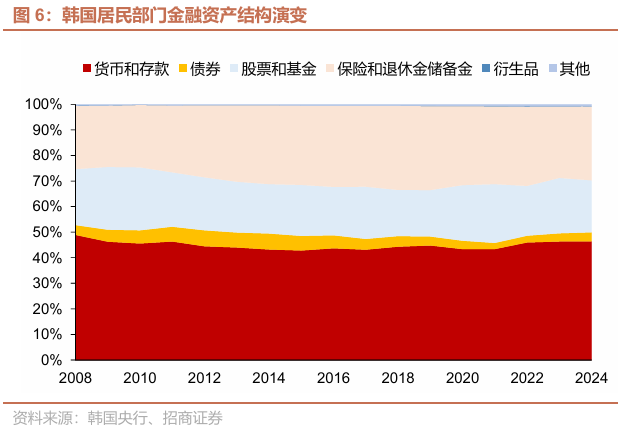 韩国居民偏好低风险资产,持有的现金与存款和保险类资产占比较高。2008-2024年间,韩国家庭部门持有的金融资产中保险和养老金明显上升,现金和存款、债券、股票和基金占比均下降。截至2024年,韩国家庭部门的金融资产结构为:现金和存款占比46.3%、保险和养老金占比28.9%、债券占比3.6%、股票和基金占比20.3%、金融衍生品占比0.12%,其他金融资产占比0.8%,较2008年分别变动-2.6个百分点、+4.1个百分点、-0.2个百分点、-1.6个百分点、0、+0.3个百分点。保险和养老金占比提升明显,现金和存款、债券、股票和基金占比均下降,衍生品由于体量太小占比变化也很小。
