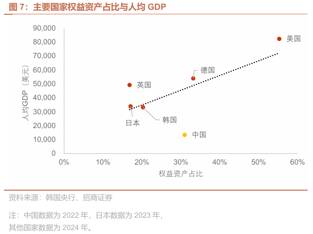从发达国家经验看,人均GDP与权益资产在总金融资产中的配置比例正相关。横向对比美日德英韩的人均GDP与权益资产比重,基本符合上述规律。我国人均GDP为美国的六分之一,我国权益资产占比为31%,已相对较高。