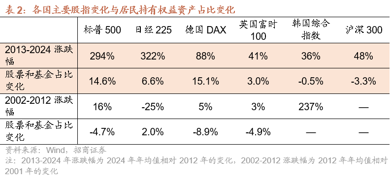 近年来的实际情况表明,居民持有权益资产的比例与股市长期表现正相关。横向对比,2013-2024年,美日德居民持有的股票基金占比均持续上升,英韩则未出现这种情况,或与各国股市表现有关:这一时期美日德股指涨幅较高。纵向对比,2001-2012年美日英德股市表现平淡,美英德权益资产占比均出现下降。