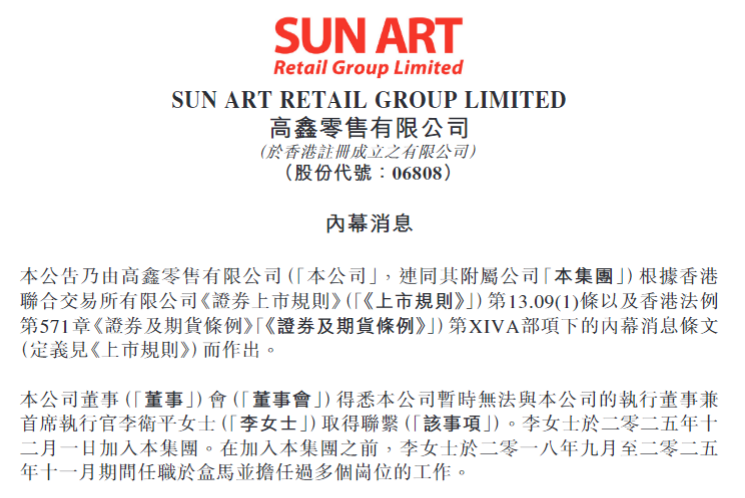 2月4日,大润发母公司高鑫零售(06808.HK)在港交所发布公告称,公司董事会得悉公司暂时无法与执行董事兼首席执行官李卫平取得联系。截至公告日期,据董事所深知、尽悉及确信,该事项与本集团之业务及营运并无关联。