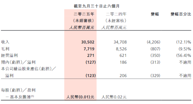 业绩方面,根据高鑫零售于去年11月公布的2026财年中期业绩报告,公司在该报告期内实现收入305.02亿元,同比减少12.12%;毛利77.19亿元,同比减少9.46%;期内亏损1.27亿元,公司权益股东应占亏损1.23亿元。截至2025年9月30日,公司共有462家大卖场、32家中型超市以及7家M会员店。