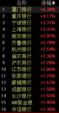 早盘银行(核心股)股逆势爆发,截至午间收盘,银行板块上涨1.55%。领涨股厦门银行涨6.38%,重庆银行涨超4%,宁波银行、上海银行涨超3%。