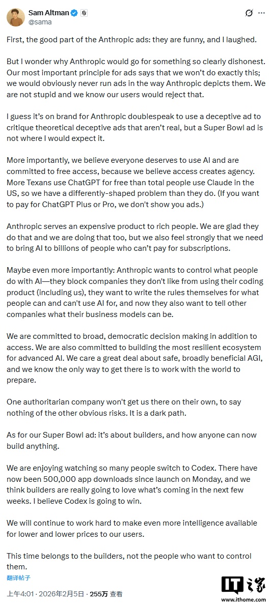 IT之家2月5日消息,当地时间周三,萨姆 · 奥尔特曼在 X 平台发文回应 Anthropic 全新的超级碗广告,称这家 OpenAI 的竞争对手的宣传活动“明显存在不实信息”,还表示 Anthropic 搞“含糊其辞的双面话术”是其一贯作风。他写道:“我们绝对不会以 Anthropic 所描述的方式投放广告,我们并不愚蠢,也清楚用户绝不会接受这种做法。”