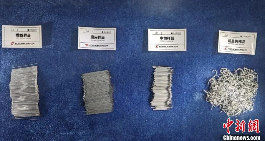 长明渔具有限公司内展示的鱼钩部分制作过程。 熊锦阳 摄