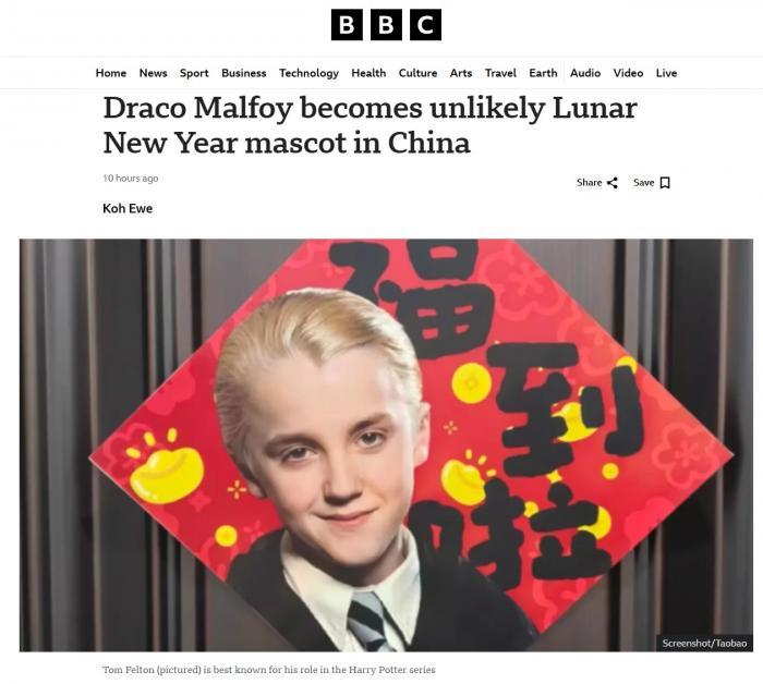 2月3日,饰演马尔福一角的英国演员汤姆·费尔顿在个人社交账号上转发了当地媒体对马尔福福字走红中国社交平台的报道。图片中是中国商场内悬挂的一幅巨大马尔福春节海报,下方字幕写着“德拉科·马尔福突然成了中国新年的象征”。