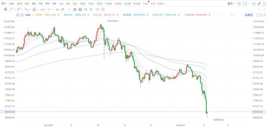 2月6日,比特币昨日暴跌14%,今早一度再跌近5%至6万美元,创2024年10月以来新低,较2025年10月创出的历史最高位(126199.63美元)跌去52.4%,抹去了自特朗普上任并表示支持加密货币行业以来的所有涨幅。