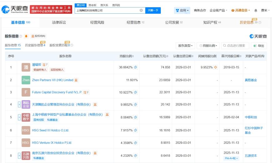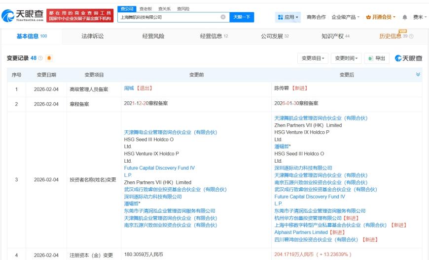 天眼查显示,近日,上海舞肌科技有限公司发生工商变更,新增中国移动旗下上海中移数字转型产业私募基金合伙企业(有限合伙)、Alphaist Partners Limited等为股东,同时,注册资本由约180.3万人民币增至约204.2万人民币。