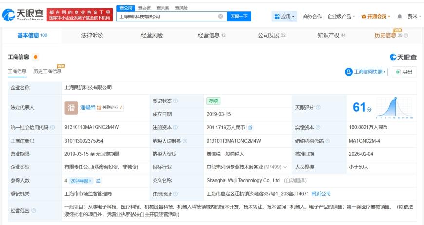 该公司成立于2019年3月,法定代表人为潘韫哲,经营范围包括从事电子科技、医疗科技、机械设备科技、机器人科技领域内的技术开发、技术转让、技术咨询等,现由潘韫哲、天津舞肌企业管理咨询合伙企业(有限合伙)及上述新增股东等共同持股。公开资料显示,该公司专注于机器人电机技术研发及电子科技领域的技术服务。