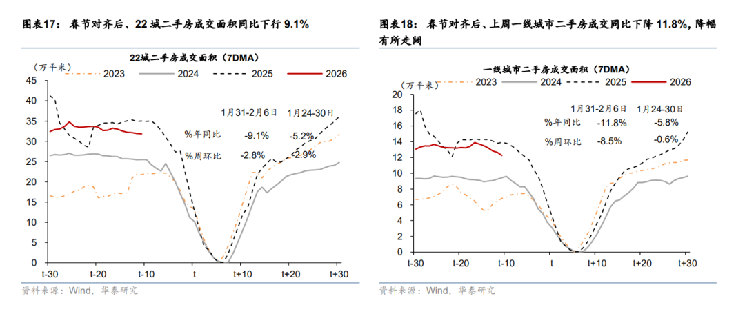 需求侧,国内地产周期能否企稳是内需回升最为关键的变量。农历春节对齐后,上周44城新房/22城二手房成交面积同比降幅小幅走阔,上周44城新房/22城二手房成交面积同比降幅由前一周的28.3%/5.2%走阔至34.4%/9.1%。但一线城市新房成交面积同比降幅有所收窄,一线城市新房成交面积同比降幅从前一周的38.8%收窄至28.1%,一线城市二手房成交面积同比降幅从前一周的5.8%走阔至11.8%(图表15-18)。整体而言,一线城市地产需求改善的可持续性仍待观察。近期上海亦启动二手房收储政策,对需求的托举效果亦需观察——2月2日,上海收购二手住房用于保障性租赁住房项目工作实质性启动。上海市住建委有关负责人在签约活动上表示,上海开展收购二手住房用于保障性租赁住房工作,是精准对接新市民、青年人、大学毕业生、各类人才等群体的租赁需求,助力构建青年发展型城市的有力举措,上海市浦东新区、静安区、徐汇区作为首批试点区。