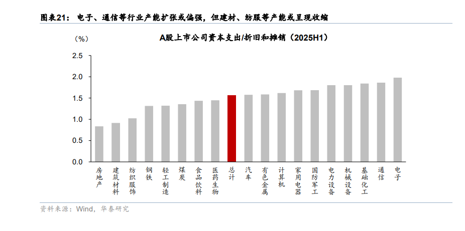 供给侧,多视角的分析显示,制造业产能扩张在2023年后就已经开始明显放缓,2025年加速出清。如果需求企稳,总体价格指标有望延续修复态势。中观和微观层面数据显示,大部分传统行业自2023年中以来产能扩张逐步放缓。全A非金融地产上市公司资本开支增速在2023年中后放缓,在2024年2季度转负——已经持续6个季度下降。从上市公司资本开支/折旧与摊销来看,截止25年中报,建材、纺服等行业产能持续收缩;从工业品产能看,22-25 年,手机、水泥、化肥、电解铝等产能收缩。具体而言: