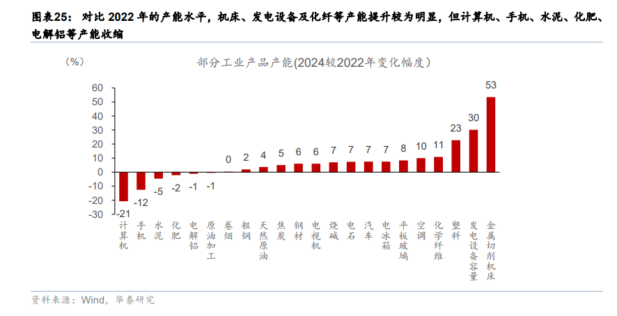 此外,统计局公布的主要工业产品的生产能力显示,对比2022年的产能水平,机床、发电设备及化纤等产能提升较为明显,但计算机、手机、水泥、化肥、电解铝等产能收缩(图表25)。