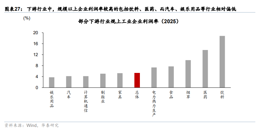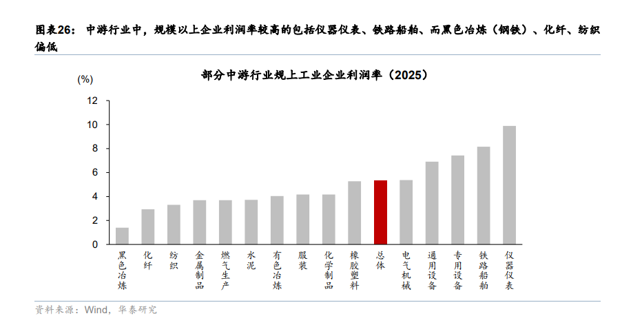 然而,原材料及AI基建相关“耗材”价格上升也对部分价格传导能力较弱中下游制造业带来了盈利压力。根据规上工业企业财务数据,截止2025年,中下游行业中,钢铁(核心股)、化纤、纺织、汽车等行业利润率水平较总体偏低,原材料价格上行对其盈利的影响可能相对较大。