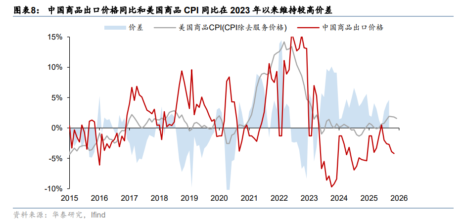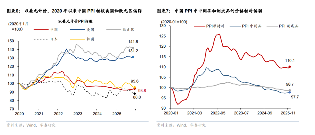 自2020年以来,中国、美国与欧盟的生产者价格指数(PPI)走势出现分化。 截至2025年12月(以2020年1月为基期),美国与欧元区PPI分别累计上涨31%和44%,中国PPI累计下跌6.2%。价差分化的核心在于国内中下游环节:在国内PPI中,上游原料价格尚有支撑,但中间品及产成品价格表现持续偏弱,2025年11月中国商品出口价格同比下跌4.2%,而美国国内商品消费者价格指数(CPI)同比仍上涨1.8%,二者价差达6个百分点。