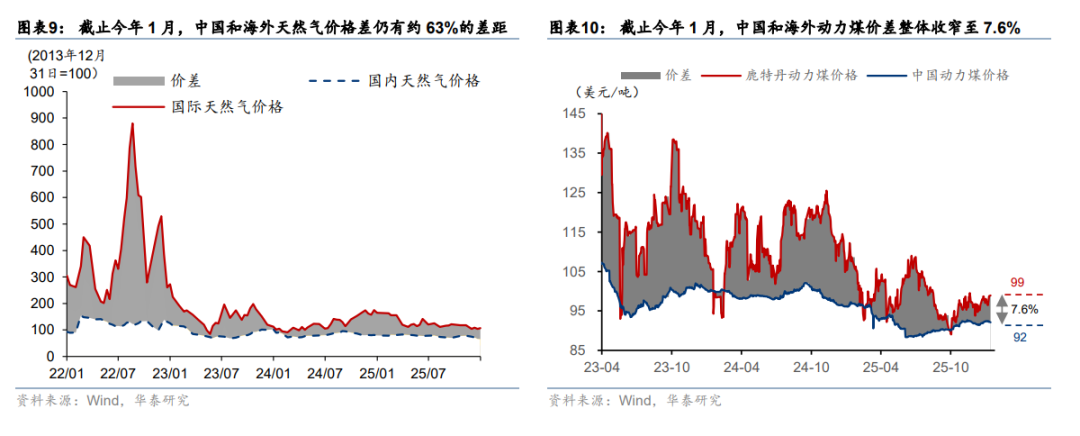 外需“议价能力”仍强于内需。美元计价、2020年1月至2025年底,美国和欧元区PPI累计上涨31%/44%,中国PPI下降6.2%。其中,中国PPI上游与中下游呈现分化,中间品及下游产成品相对偏弱。2025年以来,部分上游能源类商品中外价差逐步收窄,比如中外天然气(核心股)价差从2022年的高点收敛至今年1月的63.0%,仍高于2015-2019年均值(21.3%)。