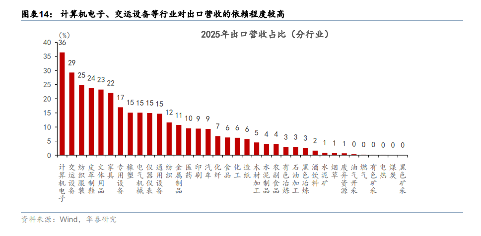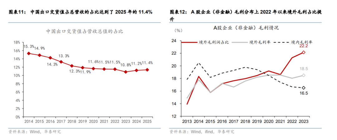 上市公司数据也佐证外需敞口较大的行业对涨价的传导能力较强。从出口交货值占企业营收的比例来看,计算机电子、交运设备、纺服、家具等海外需求依赖度相对较高。具体而言,计算机电子(36.4%)、交运设备(29.3%)、纺织服装(核心股)(24.9%)、皮革制鞋(23.8%)、文体用品(23.3%)、家具(22.1%)是我国2025年出口营收依赖度最高的6个行业。边际变化而言,交运设备(2025年出口交货值占营收的比例较2023年上行9.2个百分点,下同)、纺织服装(+3.0pp)、专用设备(+2.4pp)、家具(+2.1pp)等行业的出口营收依赖度明显提升,而计算机电子(-4.9pp)、有色矿采(-1.4pp)、文体用品(-0.8pp)等行业则有所回落。而截止2025年中报,A股上市公司财务数据显示整体毛利率水平自2020年回落以来边际改善,或显示内需边际企稳(图表13)。A股上市公司数据亦显示,境外业务毛利率水平在2021年以后高于境内业务水平(图表12),或显示外需拉动较强的行业可能对上涨的传导能力相对更强。