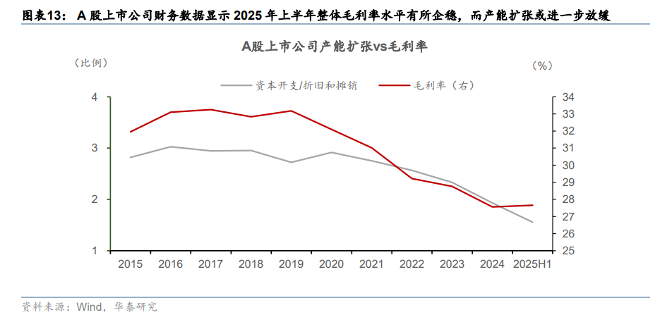 上市公司数据也佐证外需敞口较大的行业对涨价的传导能力较强。从出口交货值占企业营收的比例来看,计算机电子、交运设备、纺服、家具等海外需求依赖度相对较高。而截止2025年中报,A股上市公司财务数据显示整体毛利率水平自2020年回落以来边际改善,或显示内需边际企稳。