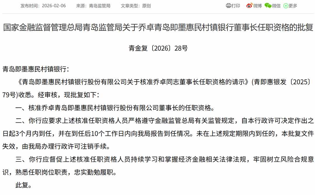 2月6日,国家金融监督管理总局青岛监管局公布相关批复,核准乔卓即墨惠民村镇银行董事长的任职资格。批复时间2月5日。与此同时,卢梦雪、许超青岛即墨惠民村镇银行股份有限公司董事的任职资格也被国家金融监督管理总局青岛监管局核准。