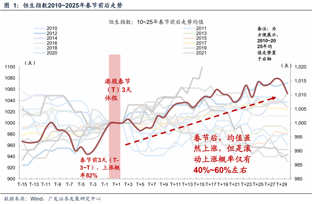 节前3个交易日恒指上涨概率82%。基于2010至2025年恒生指数春节窗口的历史表现,节前最后三个交易日(T-3至T区间),指数上行概率为82%,均值在该阶段表现为斜率更陡且方向一致的抬升,反映出节前资金行为更趋同、短期做多一致性更强。