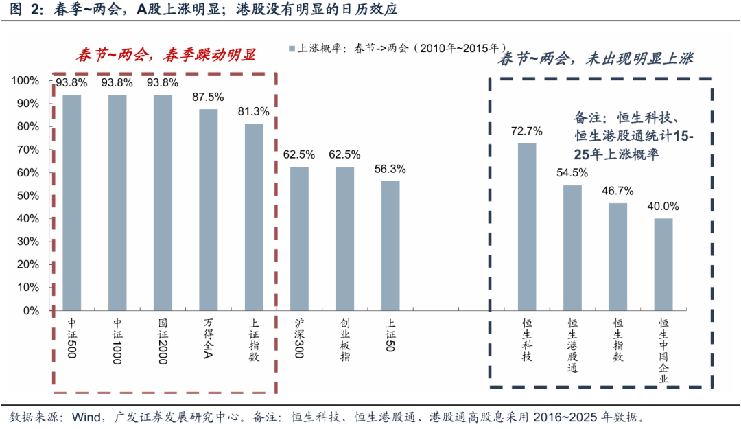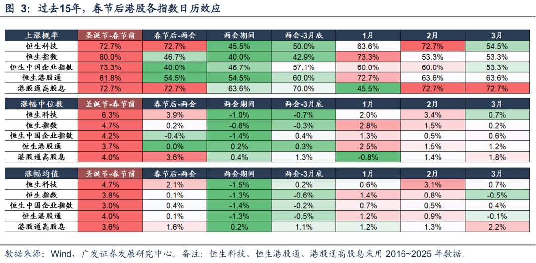 但从逻辑和数据验证上看,春节后-两会的典型窗口并不天然适配港股,港股在春节后并未有明显的日历效应。(1)逻辑上看,恒生指数和恒生科技虽然也是极强的顺周期性,但从行业结构上看,成分股主要是互联网相关,两会可能出现的宽财政政策通常作用于地产链、基建链,对互联网的直接拉动效应不大。(2)数据上也确实不支持,港股在春节后-两会期间效果不明显。过去15年内,恒生指数在春节后-两会上涨概率仅约46.7%;恒生科技在春节后-两会阶段虽为72.7%的上涨概率,但统计口径较短(2016年至今),且涨幅中位数、均值较圣诞节-春节前明显回落;此外,恒生港股通、恒生中国企业指数上涨概率也仅为40.0%和54.5%,并未体现明显的春季躁动。