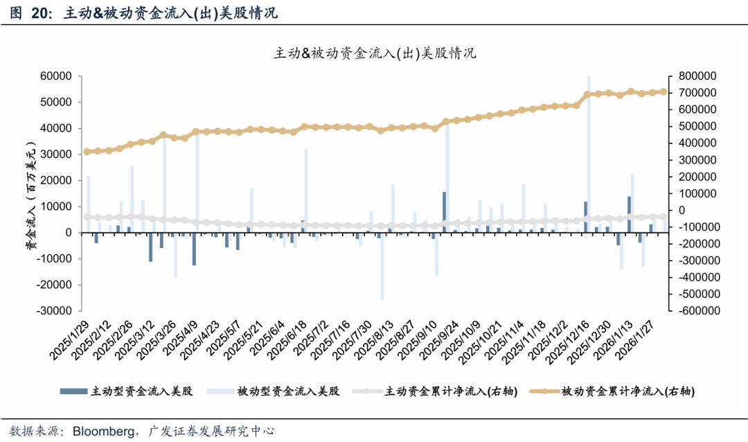 美股主被动资金流入收敛。截至本周三(1月28日—2月4日),美股主动资金流入2.20亿美元,较上周流入32.17亿美元收敛;被动资金流入56.10亿美元,较上周流入60.09亿美元收敛。
