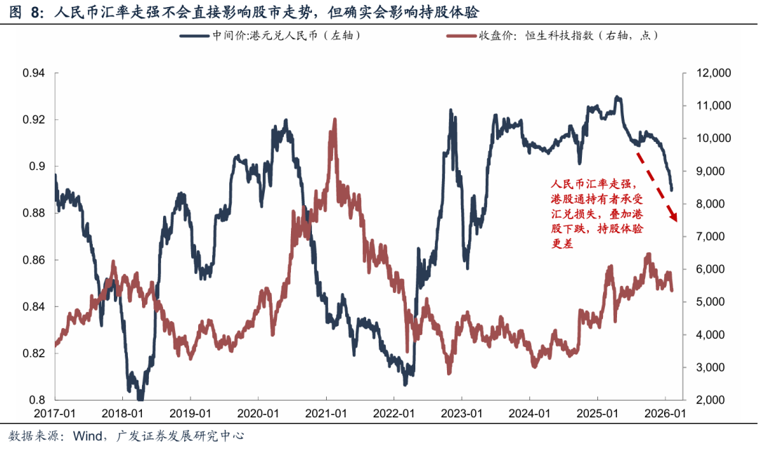 (二)近期人民币汇率走强,虽不会影响港股走势,但汇兑损失影响下,确实导致持股体验更差
