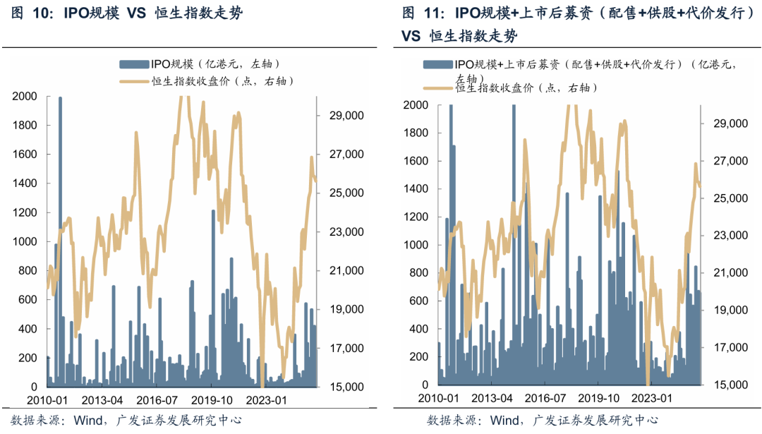 IPO规模高峰、募资高峰(算入上市后募资,即配售+供股+代价发行)并不会扭转港股的趋势。典型的例如2010年、2014-2015年、2017年、2020年、2025年港股的募资高峰都未影响港股的牛市,背后可能是由于港股市场出现明显好转,部分企业有扩张需求,选择相对高点在资本市场募资。