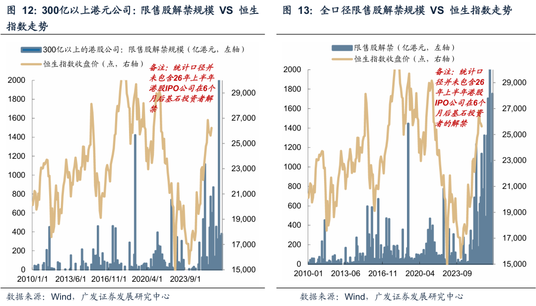 (4)港股天量IPO对市场影响不大,影响主要在于IPO过后6个月的解禁高峰。典型的例如11年年中、15年下半年、19年3月、21年二季度、22年年中,解禁潮都与港股下跌出现在相似时间段。26年3月主要是有色金属(核心股)(紫金黄金国际、南山铝业国际)+茶饮(蜜雪冰城)的解禁潮,中大型规模公司的解禁规模872亿港元,高于去年年末的解禁小高峰。由于港股通账户并不能够参与打新,享受稀缺性公司的上市红利,却需要承受限售股解禁带来的风险,这可能确实是南向资金对于2026年港股的主要担忧之一。