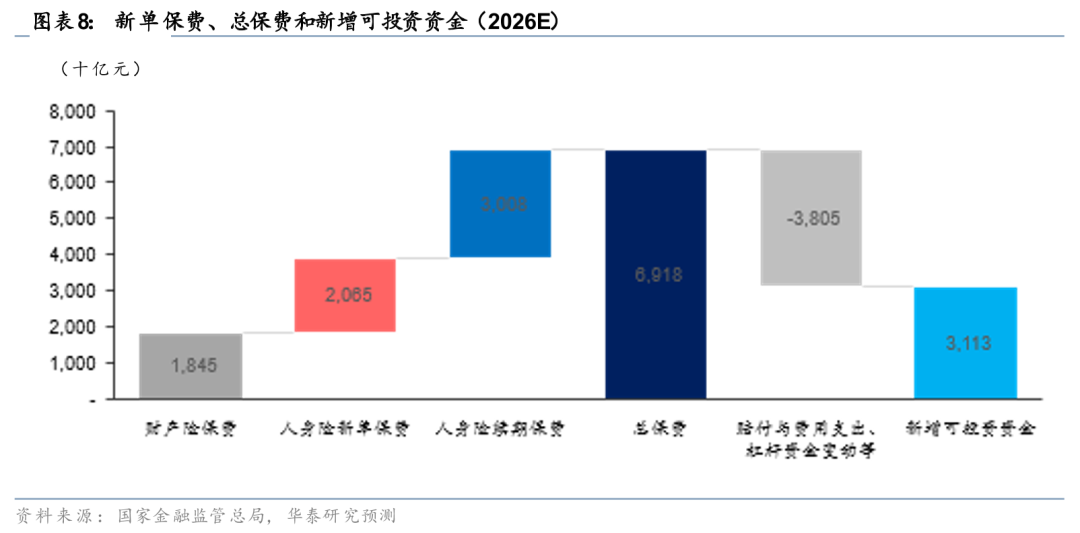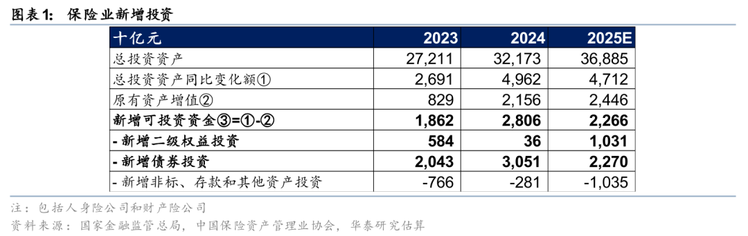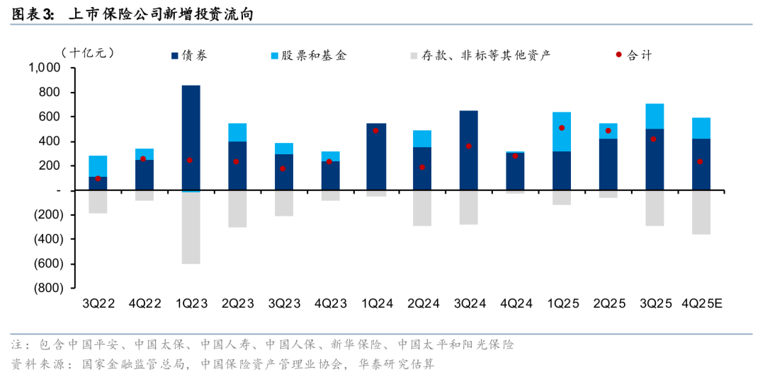 新增可投资资金来源于当年收取的总保费,总保费包含新单保费和续期保费,总保费扣除各种赔付和各类费用之后的净额用于投资。我们估计2025年新单保费3.4万亿(其中人身险1.7万亿,财产险1.8万亿),总保费6.1万亿,扣除掉赔付、费用和杠杆调整后的新增可投资资金为2.3万亿。通常一季度的新单保费规模最大,但叠加续期保费、赔付等影响,新单保费未必能代表新增可投资资金的趋势。