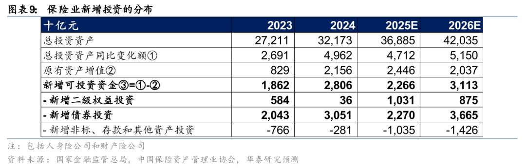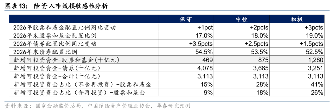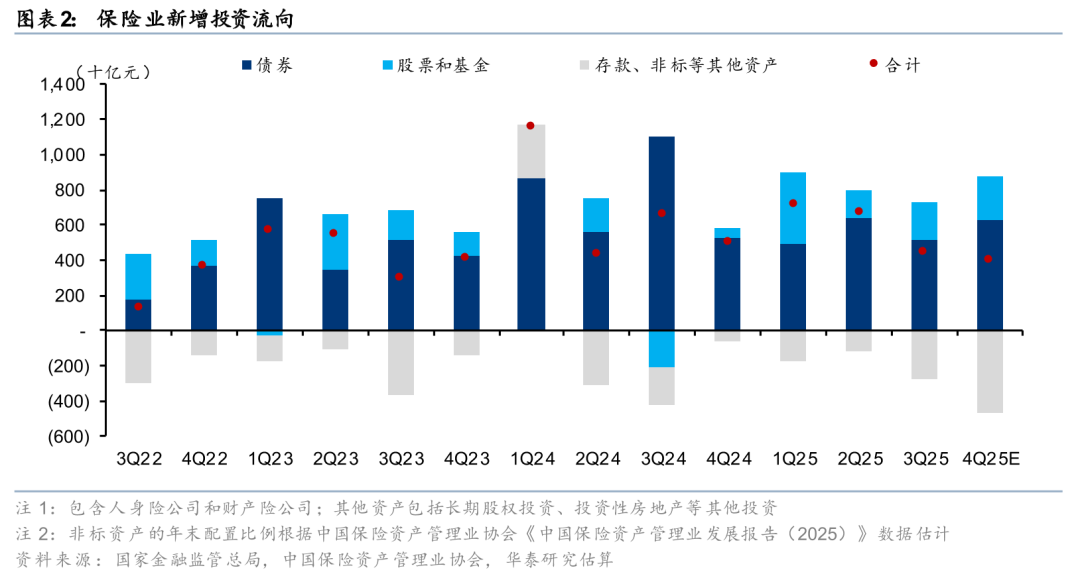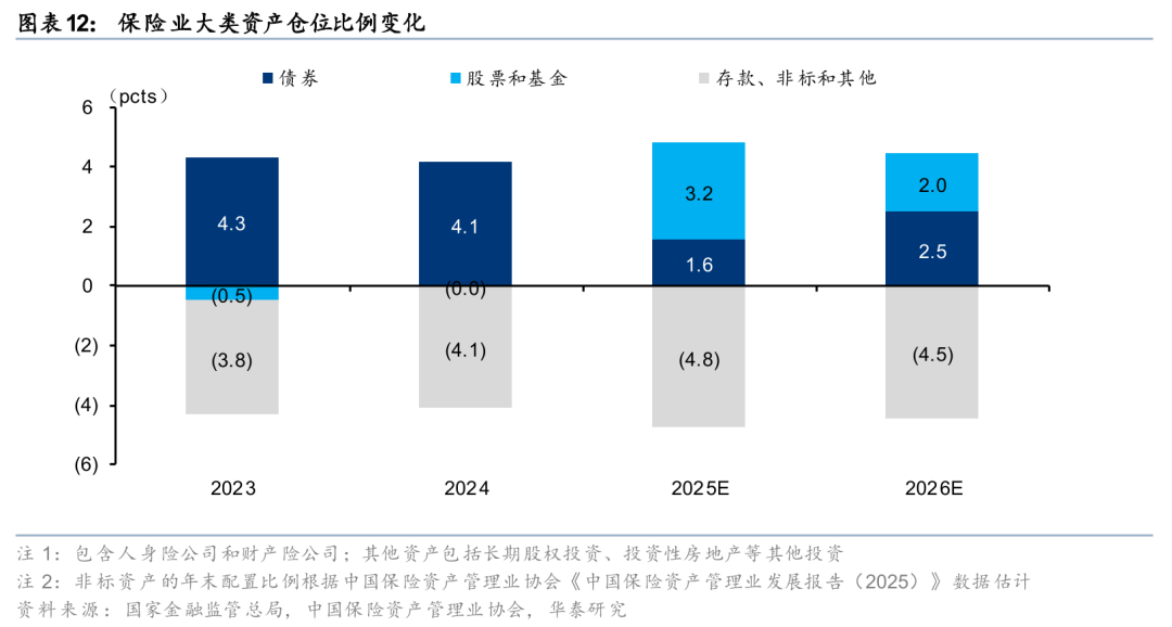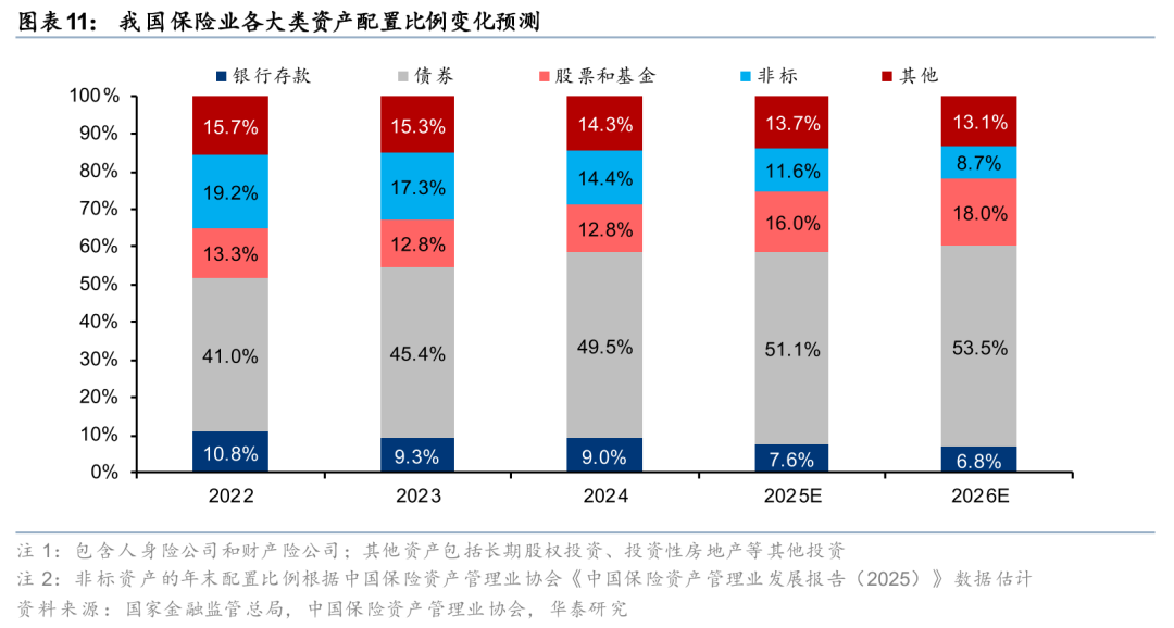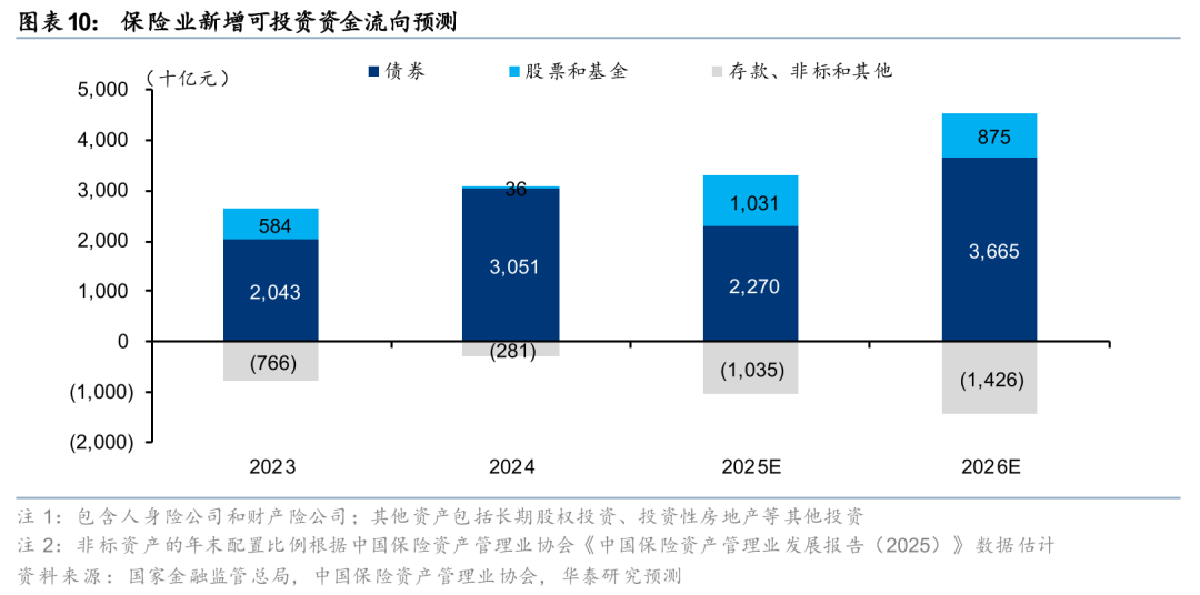 我们假设2026年二级权益资产各季度收益率为3%,全年贡献资产增值约0.8万亿元,加上新增投资约0.9万亿元,预计2026年末二级权益资产余额将增加约1.7万亿元至7.6万亿元,占总资产比重提升至18%。债券方面,考虑到2026年利率或呈震荡走势,我们假设债券资本利得收益不明显,同时新增投资规模约3.7万亿元,预计2026年末债券资产配置比例将上升至53.5%左右。非标资产、存款及其他资产的余额则可能有所收缩,我们估计合计释放资金1.4万亿元。