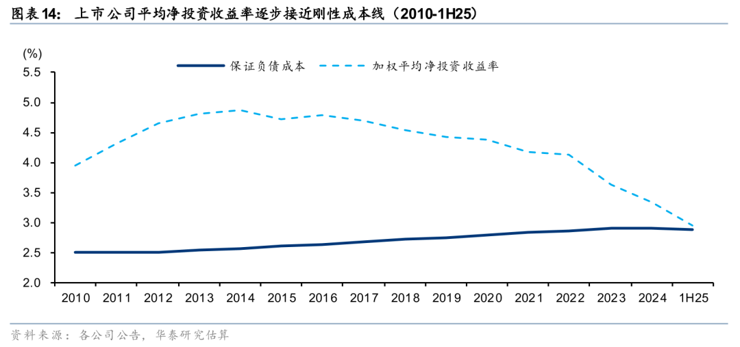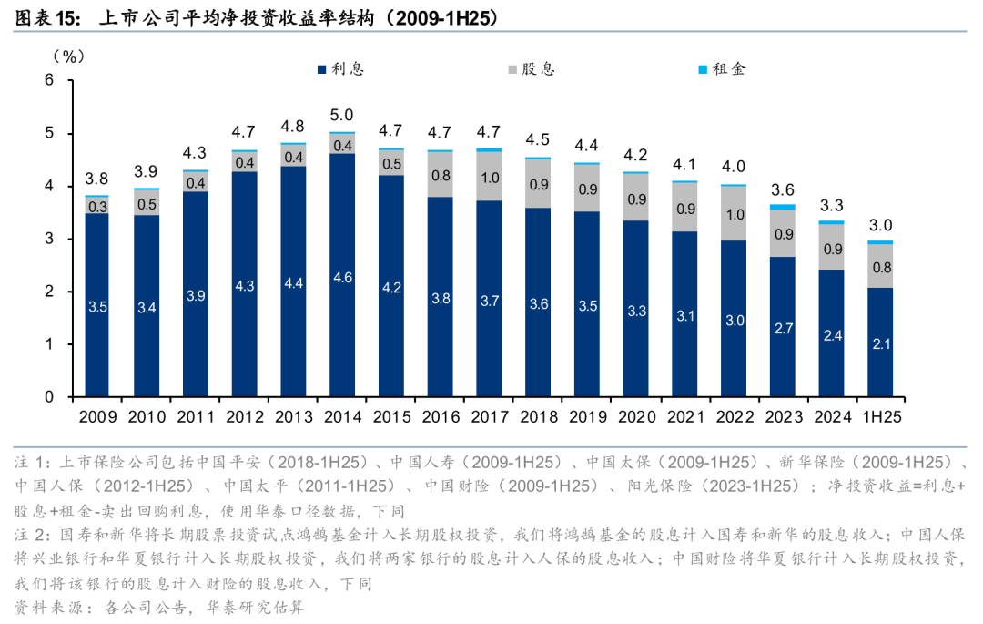 净投资收益在利率下行环境下面临较大压力,险资仍需增配高息股。净投资收益率(NIY)仅包含利息、股息和租金这三类可重复发生的现金收益,并扣除险资加杠杆(卖出回购)的利息成本,是险资投资表现的核心和压舱石。总投资收益率在其基础上,加入计入利润表的资本利得,综合投资收益率则再加上计入其他综合收益的资本利得。总/综合收益率围绕NIY波动,NIY代表了险资的现金投资收益,相对稳定且可预期性强,是险资投资表现最重要的衡量指标。2018年后,伴随着市场利率的不断走低,保险NIY也节节下行。2023年以来的利率较快下行对险资带来较大压力,平均NIY从2022年的4.1%下降至1H25的3.0%,而目前保证负债成本在3%左右,净投资收益率逐步接近刚性成本线,面临较大压力,未来或继续下行。从净投资收益率的结构看,利息的贡献近年来快速下降,为了提升净投资收益率,保险公司仍需坚持增配高息股,通过抬高股息贡献来稳定净投资收益率。