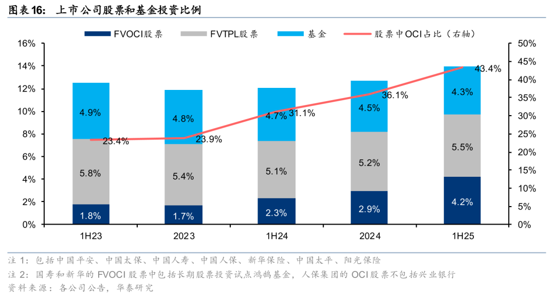 险资红利策略的核心目的在于获取股息现金,弥补利息现金收益的不足,以覆盖负债端的保证成本。在利率尚未明显反弹的背景下,利息贡献可能进一步收窄,红利股成为险资重要的现金收益来源,我们预计未来每年红利股增配额约为3000-5000亿元(《险资红利策略2.0》,2025 年10月24日)。在2025年险资大幅加仓之后,我们认为红利股(通常计入FVOCI科目)还能够降低权益敞口对利润的影响。截至1H25,上市公司股票和基金中,影响利润的FVTPL资产比例为70%,占总资产比例9.7%。出于收取红利和降低利润波动的目的,我们认为险资应持续增加红利股的投资并计入FVOCI会计科目。