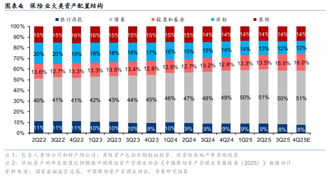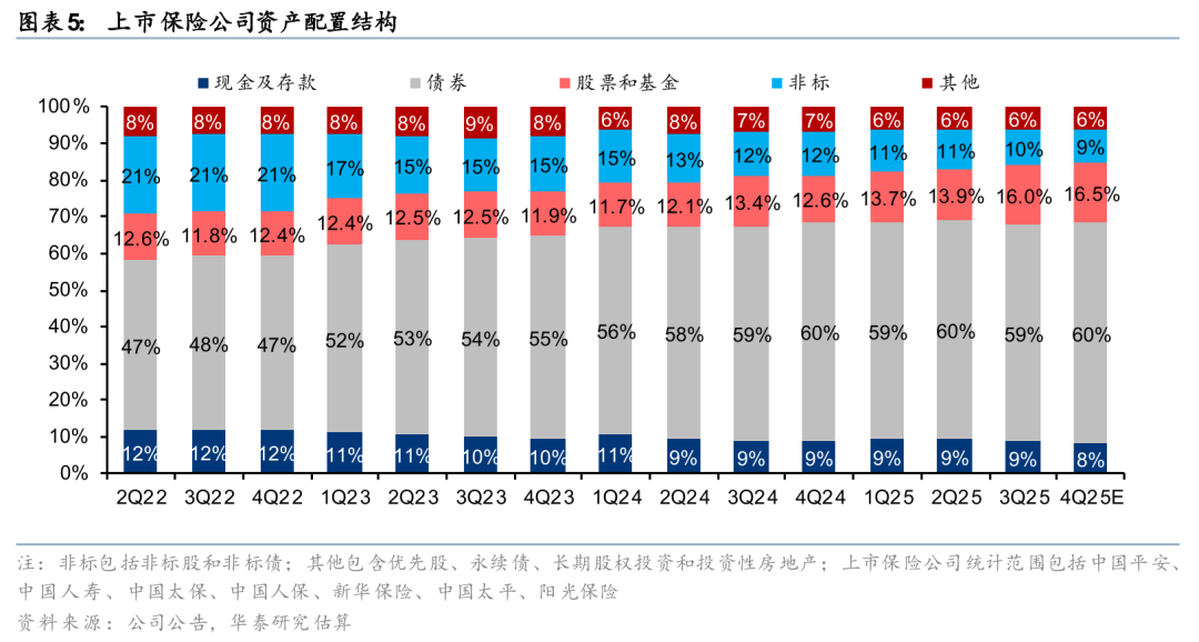 我们估计,主要上市保险公司(中国平安、中国太保、中国人寿、中国人保、新华保险、中国太平和阳光保险)合计投资资产在2025年底约为23万亿元,其中债券配置比例稳定(基本维持60%),而股票和基金的配置比例大幅提升至16.5%左右,非标资产、存款(含现金)和其他资产比例下滑至9%/8%/6%左右。