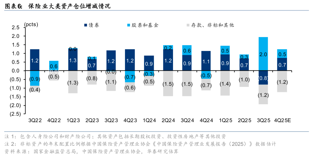 从仓位变化上看,2025年二级权益和债券有所加仓,仓位来自非标资产、存款和其他资产。股票和基金的配置比例自2Q22以来维持在相对稳定的水平(12.5%~13.6%),直到3Q25明显加仓至15.5%,达到历史高位,我们估计2025年全年共加仓3.2pcts。债券的配置比例则在过去几年长期保持上升的趋势,我们估计2025年增配节奏稍放缓,加仓1.6pcts。非标资产由于供给不足,配置比例持续下降,存款和其他资产的仓位也在下降,腾出的仓位主要用于配置债券和股票。