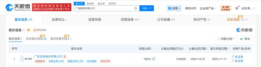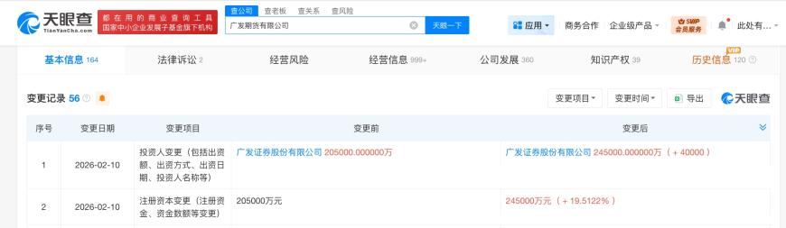 正文 广发期货增资至24.5亿 增幅约19.5% 三木 V管理员 /02-14 /0 评论 /9 阅读 0214 文章最后更新时间2026年02月14日,若文章内容或图片失效,请留言反馈! 天眼查显示,近日,广发期货有限公司发生工商变更,注册资本由20.5亿人民币增至24.5亿人民币,增幅约19.5%。 该公司成立于1993年3月,法定代表人为周伟,经营范围为商品期货经纪、金融期货经纪、期货投资咨询、资产管理、基金销售。股东信息显示,该公司由广发证券(000776)全资持股。 关键词阅读: