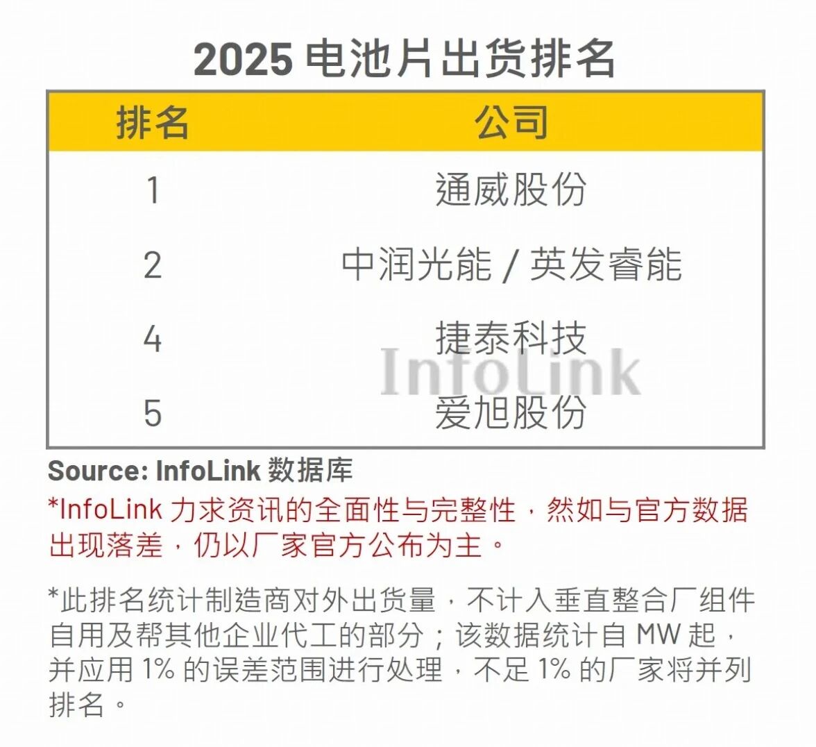 根据InfoLink的调研数据显示,2025全年前五大电池片供货商的全球总出货量约为195GW,较2024年同比增长约19.8%。在前五名排名中,通威股份依旧稳居榜首,凭借成熟的海内外渠道布局、全产业链的协同优势,叠加产品技术的持续升级,其全年电池片出货量始终保持领先态势,即便行业整体格局出现细微调整,仍稳固守住全年第一的出货成绩。