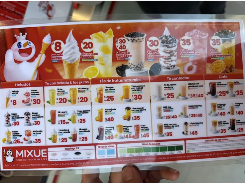 还有网友晒出了详细的价格单:柠檬水售价20比索(约合人民币8元),中杯波霸奶茶售价30比索(约合人民币12元),百香果茶售价35比索(约合人民币14元)。“排了大概40分钟的队,价格真的美。”一位网友评论道。