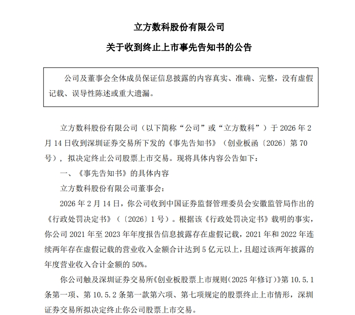 2月14日晚间,*ST立方公告称,公司于2月14日收到深圳证券交易所下发的《事先告知书》,拟决定终止公司股票上市交易,公司股票将于2月24日起停牌。告知书指出,公司2021年至2023年年度报告信息披露存在虚假记载,2021年和2022年连续两年存在虚假记载的营业收入金额合计达到5亿元以上,且超过该两年披露的年度营业收入合计金额的50%。