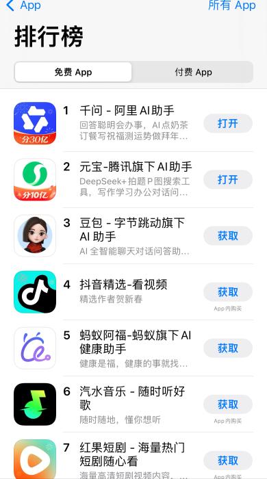 百度文心助手、腾讯元宝、阿里千问、字节豆包等已经豪掷共超45亿元,尤其是千问上线的“春节30亿免单”直接让奶茶店爆单。截至发稿时,千问APP已连续数天霸榜苹果App Store免费应用榜第一,位列其后的是元宝、豆包。