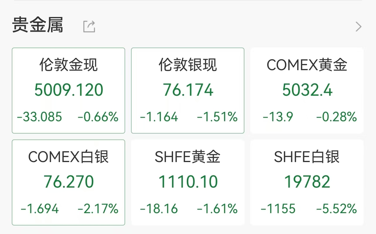 2月16日开盘,国际贵金属市场延续调整态势,现货黄金、白银双双承压下行。截至发稿,现货黄金日内跌幅扩大至0.66%,现货白银表现更弱,跌幅超1.5%;值得注意的是,白银早盘一度快速下探,最大跌幅突破3%,近期贵金属价格波动显著加剧。